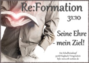 Wie jedes Jahr am Reformationstag organisiert die Evangelisch-Reformierte Baptistengemeinde Wetzlar eine Jugendkonferenz. Chris Bennett aus England wird der Gastredner sein. Er ist Dozent am London Theological Seminary. Die Themen: Die Vorherrschaft Gottes, Vorsehung, Völlige Verderbtheit, Wirksame Berufung, Das erneuernde Werk Gottes im Leben des Gläubigen, Das Reich Gottes – erste Priorität der Gemeinde. Die Freizeit findet vom 29.10.-31.10.2010 in Siegbach-Tringenstein statt.