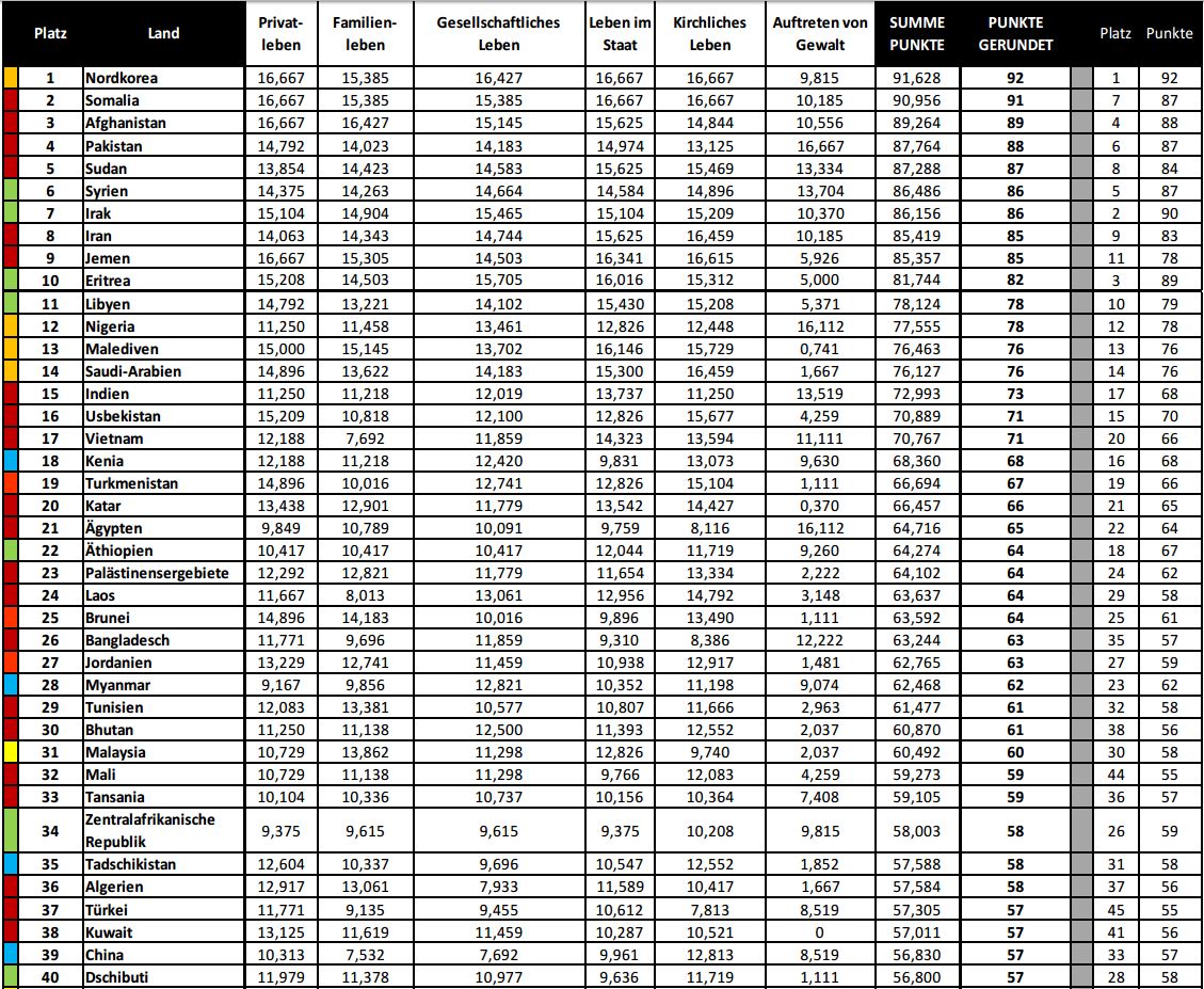 Jedes Jahr erstellt die Organisation „Open Doors“ einen sog. Weltverfolgungsindex. Er zeigt, wo die Christen am härtesten verfolgt werden.